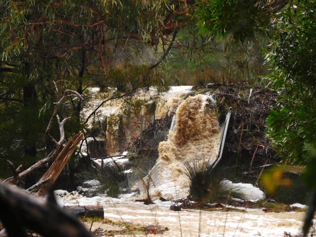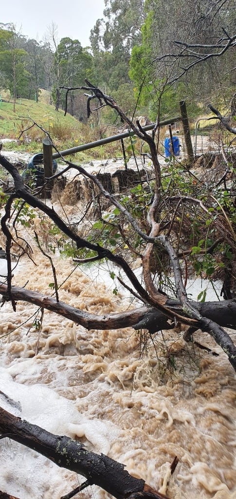 Yesterday morning we crept down to the creek to assess the damage and took some fairly dramatic photos (to compare with the more idyllic ones in the earlier post, ‘The Creek‘ below). This was our main dam overflowing. I really thought we would lose it.