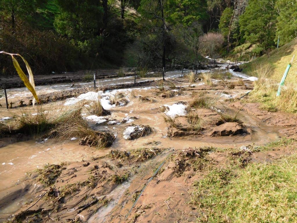 About the same as an event we had a couple of years after we settled here (in 1993) when our gentle creek turned into a colossal monster, blew out all our dams and fences and deposited over half a metre of debris along the bottom of our property. (We had to replace the creek fence). Yesterday was much the same, though the dams and fences survived (though hardly unscathed) this time.