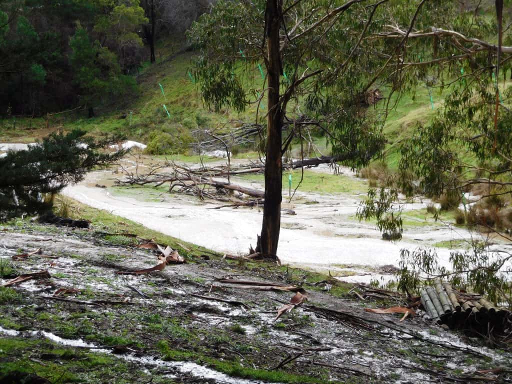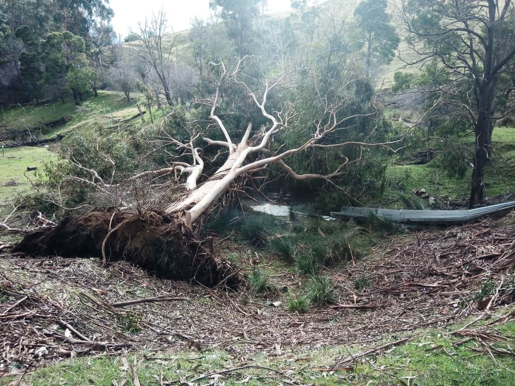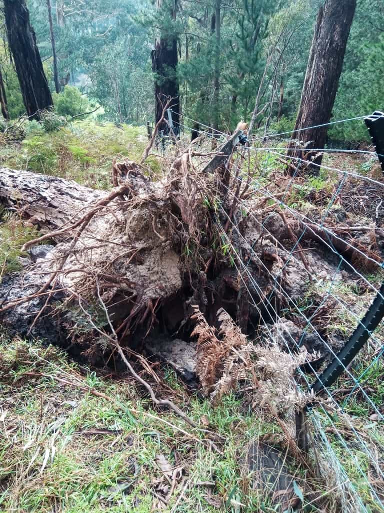 Several trees were over our lovely new fences. We have cleared some each day though others remain. Unfortunately some trees continue to fall. A huge gum came down the night before last down in the creek and just missed taking out the flume. This tree must be well over a century old, probably more like three. Anyway it is at least 3 metres in diameter at the base, so it will be a mammoth task to clear it up – the work of many days for that task alone. The koalas will miss it.