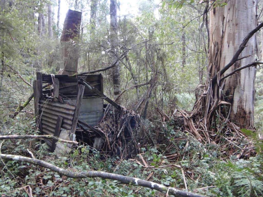 Arthur Meyers’ old shelter hut in Ross Creek, Upper Thomson Valley, Gippsland. The roof needs fixing.
