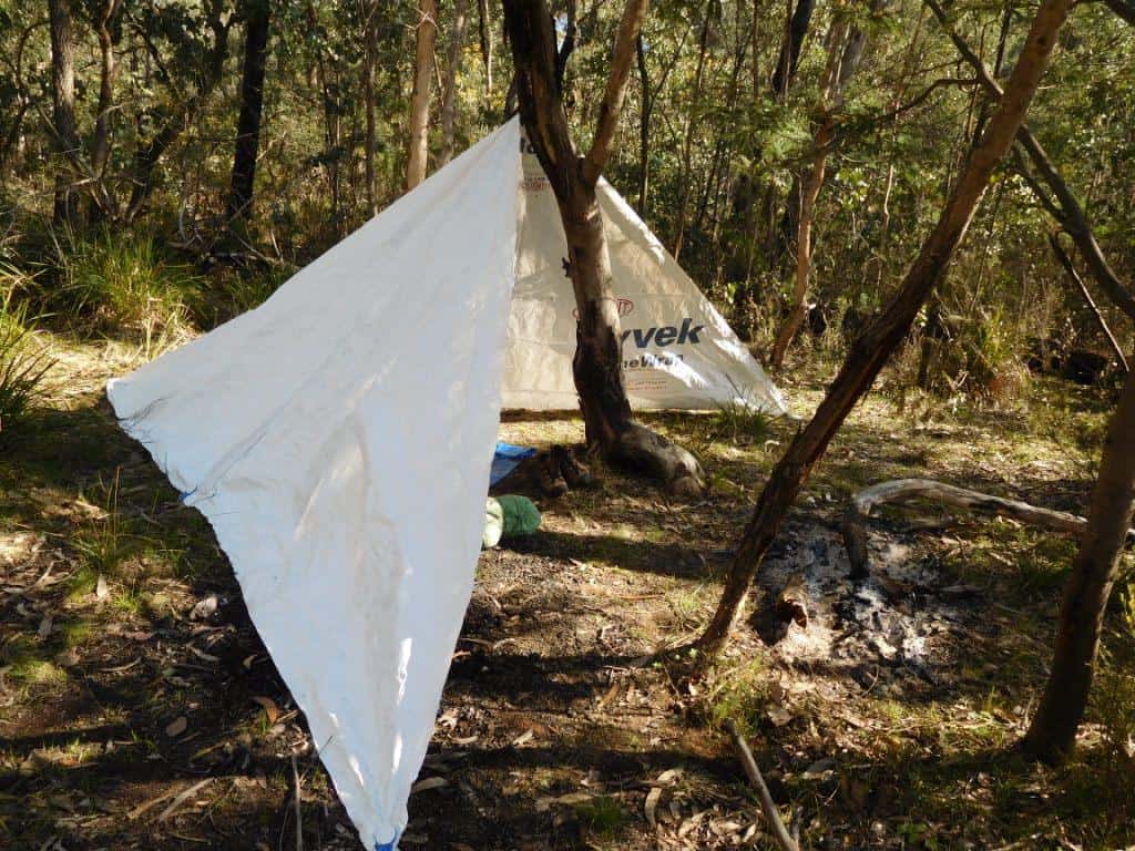 My first Tyvek bivi design provides luxury accommodation for 2-3 at least. It clearly has the JR’s tick of approval. It is a triangle with base 32’ and height 10’ (the roll width). Pitched thus it forms a triangular shelter approx 8’ deep and 16’ on a side. The two ‘wings’ can be swung inwards to provide more shelter from rain (or smoke) if the wind shifts. I have spent at least 100 dry nights camping thus.