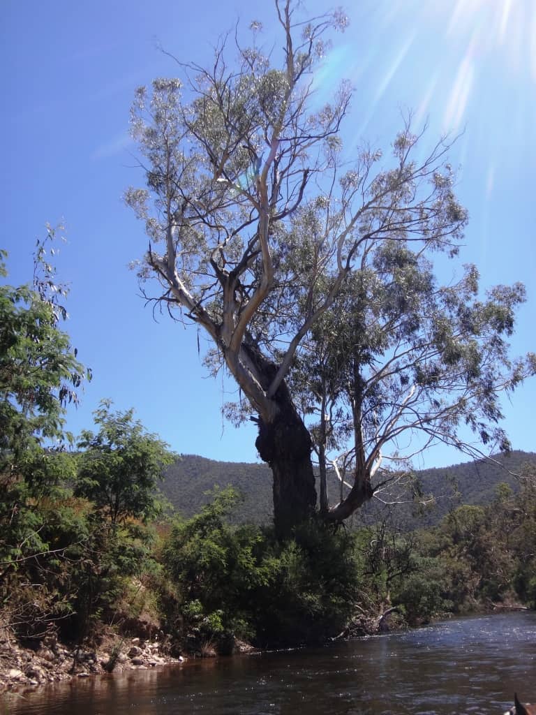 There are unfortunately many huge old gums falling into the river now. The river is also becoming shallower and wider. Though there was over 100mm more water on the gauge than last time we canoed the river we had to get out and walk at pebble races many more times. This is because the river is being silted up because of the willow removal and disastrous (poor land management by DOC) wildfires. We used to canoe the Macalister all the time until the same thing happened there . It has now become uncanoeable all summer even though it was canoeable every day of the year for a hundred years before the ‘conservationists’ took over the management of the river. There is a lesson there.