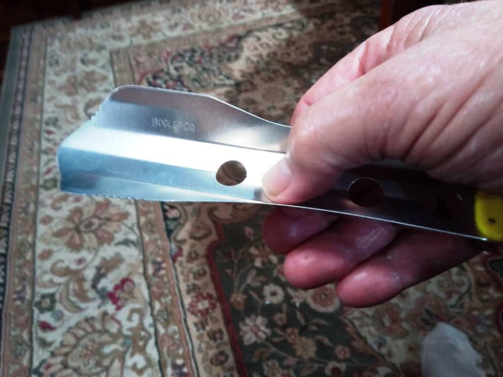 I think the .7 gram extra is worth it (for this trowel) to not wear a hole in your hand. My Bogler is 18.5 cm long, 5.3 cm wide and about 1.7 deep (7 1/4″x 2 1/8″ x 9/16″). It has some serrations in case you need to do some sawing through grass roots etc, and can be re-sharpened (eg with a triangular fie).