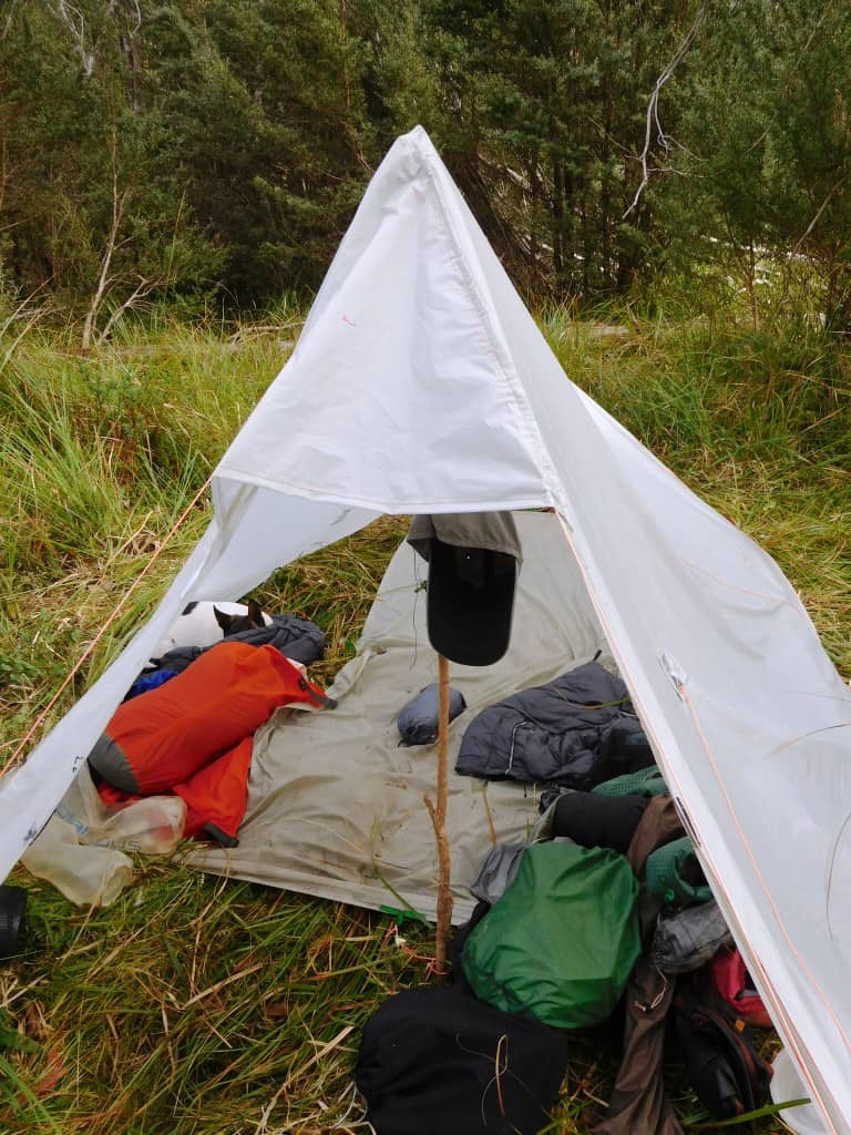 I am not such a minimalist that I insist on such an exiguity as a 7′ x 7′ tarp (or less) . My Grey Flyer tent (is huge) yet has a roof which weighs 310 grams. I am soon to make a new version of it where I will shorten it a bit and add a catenary curve to the roof line so that it ‘sits’ even better. Actually it is not sitting at all well in the photo below (and Spot has scuffed the floor away from the sides), but you can be obsessive about such things.
