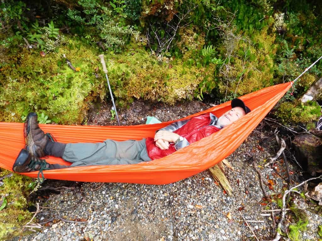 A hammock can be as little as 150 grams too complete with suspension (See Ultralight Hammock). My Hummingbird one (shown here at Dusky Sound Fiordland NZ) is more like 200 grams (with suspension).