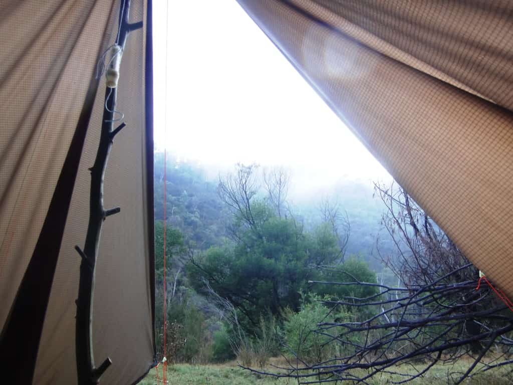 The ground was really hard where I ‘chose’ to camp so I did not get a taut pitch, as you can see. The deer were honking in the thin bush just to the right of the tent. They had grazed (and thrashed) this area extensively and clearly saw it as their own!