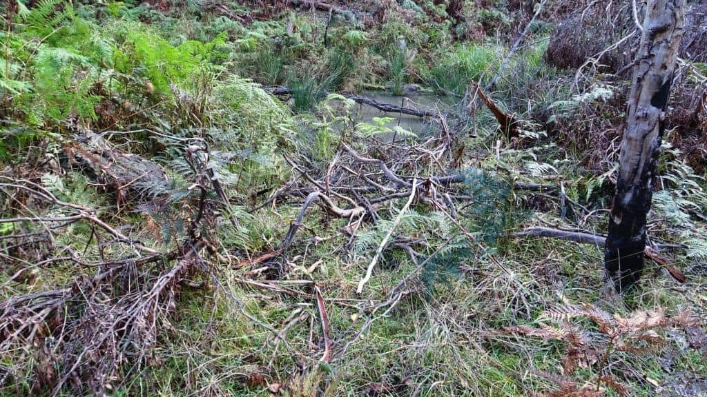 Just at the beginning there is a nasty scramble over fallen rock (and at present a large fallen tree) just at the beginning for a hundred yards or so. Don’t be put off by that. Follow the track up the hill for a kilometre or so until it appears to split in two (in actuality a turning circle). Take the right fork. (1) About fifty metres along from the fork follow a deer path down towards the river on your right. You will notice here (and elsewhere) that ‘others’ have snapped down small branches to ‘mark’ the trail.