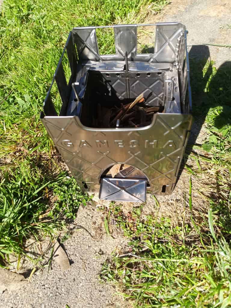 Inside you can see the double wall (gasifier) construction and also the pot supports. All the heat will wrap around your pot making it heat up very quickly indeed. The shelf at the front stops the twigs from falling out.