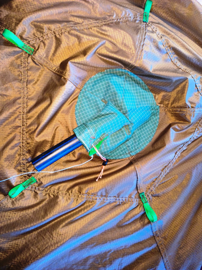 I have now received the footprint as a separate purchase so that I can save myself approx 300 grams when I don’t need bug netting (pretty much always) – 570 + 190 grams = 760 + pegs according to Asta’s specs. This will make my carry around 850 grams including pegs and guylines – pretty good for a (huge) 2 person tent/shelter. It comes with wide c-shaped pegs which are only about 5″ (I prefer 6″) but they seem to have good purchasing power. I may switch the pegs to longer ones. It has numerous tie-down points already but I may also sew on four more on the four longish sections which have none. I will also look to adding some tent anchors as per this post Windy Old Weather.