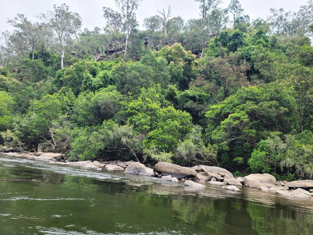 The trip involves about 1 1/4 to 1 1/2 hours in to the Weir, and about the same again out to the Final Fling Rapid steps (so around 2 1/2 hours in total); the steps require only a gentle approx thirty metre carry-out back to your car. Too easy really. There are only about ten around Grade 2 (minus) rapids overall and long languorous sections of limpid (swimming) pools except for the rather knotty rapid just below the Weir caused by the scattering of its huge monoliths along the river course. We made an approx eighty metre portage on the true right bank just below the Weir to avoid this (taped now for you). We also taped the route down from the Mitchell River Walking Track to the Weir campsite should you (also) want to walk in for an overnight camp sometime.