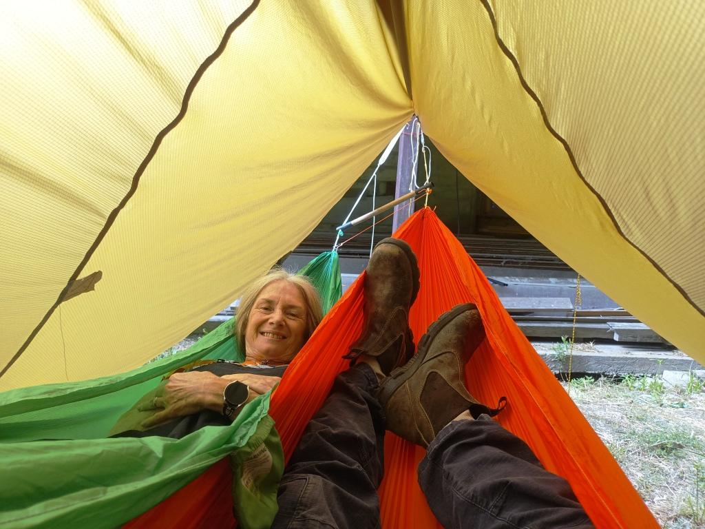 The tents I make all double as hammock tarps too. I am very taken with my (Chinese) Trailstar and wondered whether it could be repurposed likewise too. I am pleased to report that it can – and that it is (just) big enough for a tarp which both of us can lie underneath in our hammocks. (I have now perfected this arrangement). I will shortly be making a 7′ x 7′ (bathtub) floor for the tent which will also double as a poncho and a hammock tarp for one.