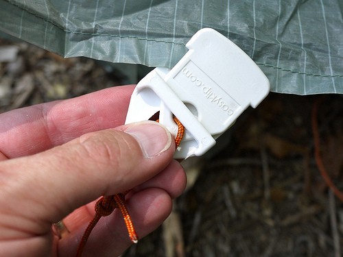 A good emergency lightweight tarp clip that will not let go: http://www.easyklip.com/ Mini = 12 grams. Of course, this remains the lightest tarp clip: http://www.theultralighthiker.com/worlds-lightest-tarp-clip/