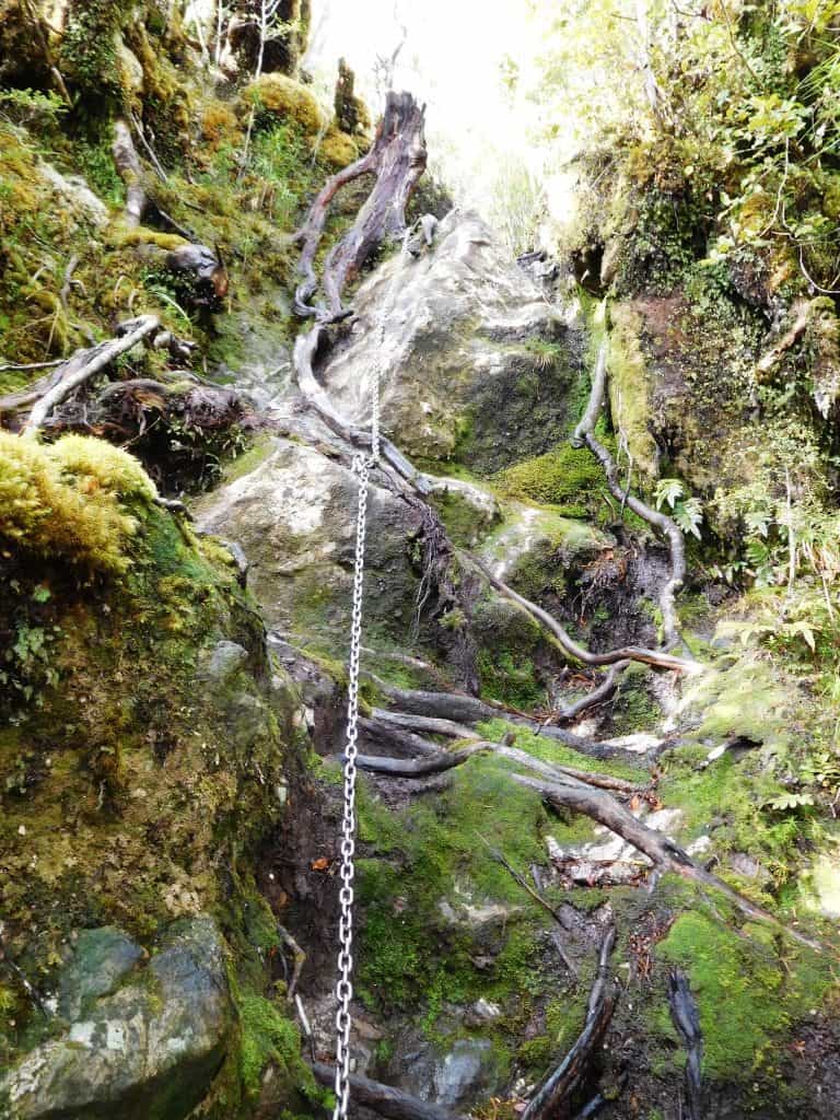 It is horrendously steep. Not a track at all, but more like some horrific ladder mostly made of tree roots and rocks. Here and there a chain for support.
