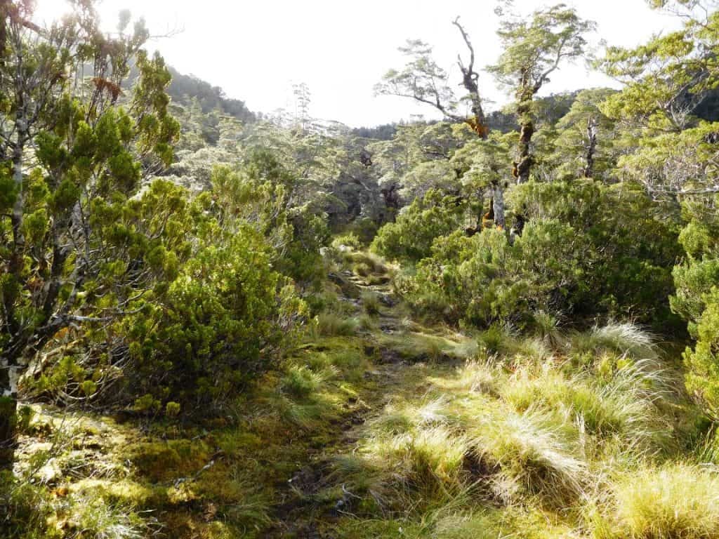 The trail begins: most of the day is tree root hopping (but it is not bad going) save between the two walk wires and after you break out onto the snow grass tops for the last half hour or so.
