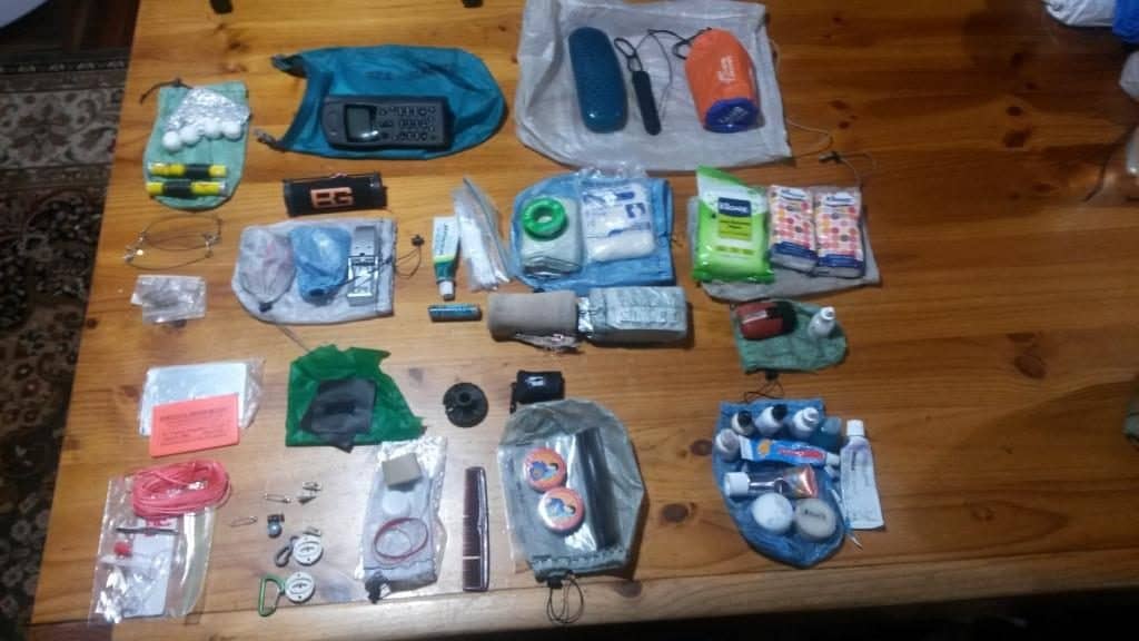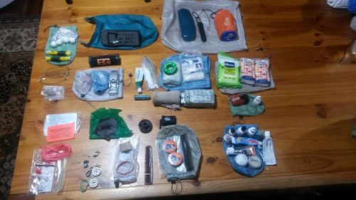Above: ‘Possibles’ bag contents: on green cuben bag: ulralight fishing kit, 2 handlines containing hooks, sinkers, bait, self threading needle (repairs), two springers, 4 polystyrene balls, alum foil for cooking fish; on green S to S bag, Iridium Sat Phone; on white cuben bag: spare glasses in plastic case, Kabar knife, Adventure Medical Kits space blanket bag (emergency day pack & ground sheet); snaploc with glasses cleaner; Bushnell mini solarwrap charger; on white cuben bag: cuben bag with charging connectors AAA to AA battery converters, in blue bag spare batteries = 6 Eneloop AAA, 2 camera, 2 phone, 2 Photon, 2 hearing aid; USB AA/AAA battery charger; first aid kit: Antisan (bites) ointment, Mylanta (indigestion), earbuds in snaploc, Leucotape on cuben bag containing variety of plasters and blister pads, triangular bandage (sling) below: elastic bandage, cuben bag with variety of tablets eg pain, inflammation, diarrhoea, allergy etc; Toiletries on white cuben bag: wet tissues, 2 pocket Kleenex (enough for a week!); below on small green cuben bag S to S ultralight head net (mozzies – sleep) and microdripper of insect repellent (Deet); magnifier on mirror; square of silnylon for repairs with 2 stickon tie outs on top; spare trekking pole basket; clip on glasses cleaner; bottom row: on snaplocc bag length Dyneema, glasses repair kit, various bits and pieces: 2 safety pins, 3 line locs, 2 tarp tie outs, I carabiner, I mitten hook, 1 cord loc, 1 spare mini compass; on cuben bag, cuben tape (repairs) rubber band, spare bottle cap; on white cuben bag: 2 lightload towels, comb, Aloksack (for camera); on blue cuben bag: microdripper bottles containing: handcream, suncream, deodorant, iodine, wash, anti fungal cream, tube anti inflammatory cream, tub toothpaste, tub heel balm; anti allergy cream.